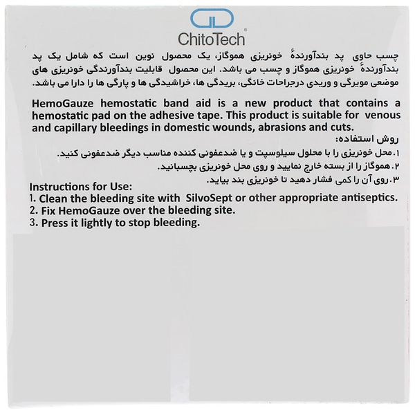 چسب زخم هموگاز محصول شرکت کیتوتک می باشد که حاوی پد بند آورنده خونریزی می باشد و دارای مزایا آماده مصرف ،استریل ، برای جراحات و بریدگی و خراشیدگی های سطحی و عمیق استفاده می شود